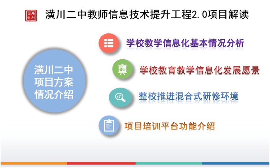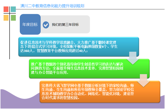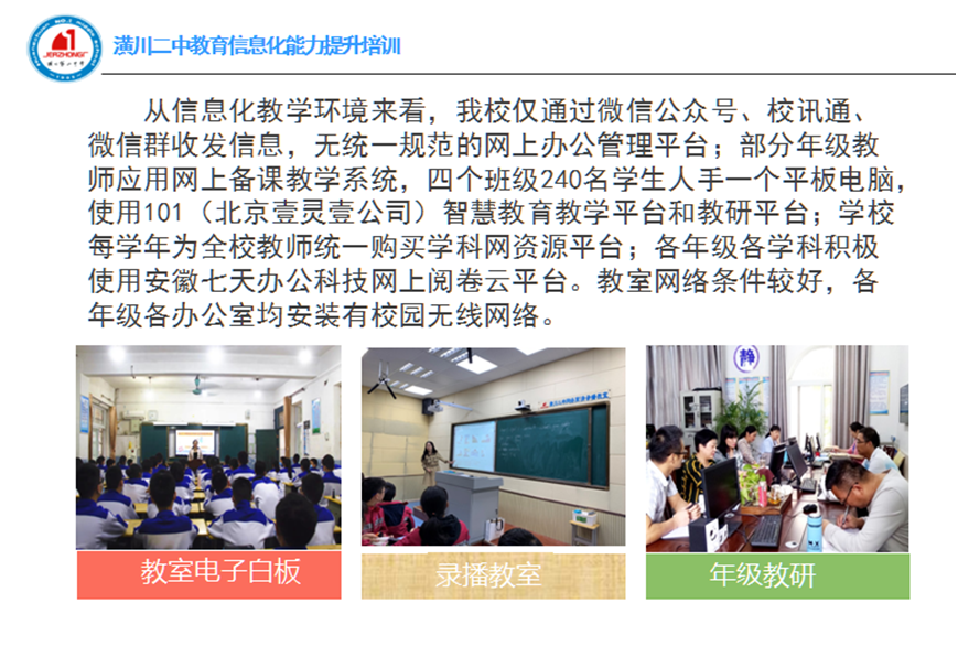 在项目启动之前,我们做了项目分析和学情数据调查,制定了《潢川县第二中学中小学教师信息技术应用能力提升工程2.0项目整校推进规划》。潢川二中共260名教师,其中40周岁以下教师仅仅达到30%左右,40周岁以上教师占大多数;学校教师中级职称以上(含中级)教师占50%以上;五十五周岁人员占15%,老龄化问题较突出。从信息化教学环境来看,潢川二中仅通过微信公众号、校讯通、微信群收发信息,无统一规范的网上办公管理平台;部分年级教师应用网上备课教学系统,目前有四个班级240名学生人手一个平板电脑,使用101(北京壹灵壹公司)智慧教育教学平台和教研平台;学校每学年为全校教师统一购买有学科网资源平台;各年级各学科积极使用安徽七天办公科技网上阅卷云平台。教室网络条件较好,各年级各办公室均安装有校园无线网络。