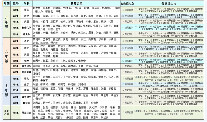 将200位教师划分为18个组,每组明确两名组长,一名为业务负责人,一名为材料负责人。精准对接提升工程2.0实施意见要求的学情分析、教学设计、学法指导和学业评价4个维度、3种教学环境中的29项能力点,为教师提供个性化的指导和服务,帮助参训教师完成至少2个能力点的学习。严格按照三种教学环境,将学校选择的能力点分配到18个组当中,同时保证每位教师涵盖二个维度,为提升组内负责人能力与控制比例需要,每组必须从学校选取的能力点中选取9个,包括1个必选微能力点和9个备选微能力点,切实做到后期研修磨课时有助于组内研修交流,教学相长。