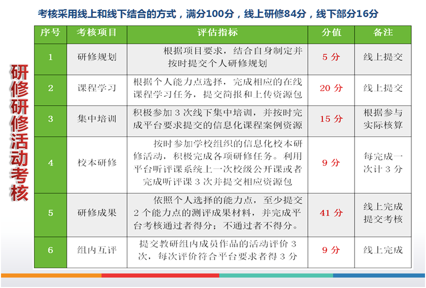 12月份,校级培训研修管理团队再次聚在一起,商讨制定我校《信息技术应用能力提升工程2.0校本应用考核方案》,要求参训教师根据考核规范,从自己所选的两个微能力点的选择其中一个能力点提交一份作品,通过“教研交流+质量提升”研修活动和校级公开课比赛;将教师信息技术应用能力作为比赛评价条件;将信息技术应用能力培训纳入教师培训学分管理。对教师信息技术应用能力提升工作进行过程监督和质里评价,并将评价结果纳入学校里化考核和评先选优工作。校级技术骨干指导参训教师按照个人选择的微能力点,完成线上20学时的课程学习、线下课程实践,完成并上传二个“微能力点”成果20学时;研课磨课10学时;深度融合“教研交流+质量提升”校本研修活动,寻找一般基本功、课堂教学功、专业技能功与微能力的切合点,力求校本研修凸显信息化,彰显现代化。