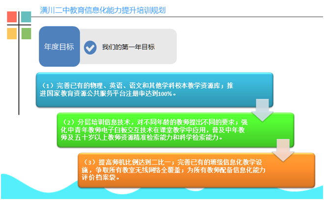 制定了信息技术能力提升工程2.0项目总体目标:通过强化技术在课堂教学中应用,不断改善教师的信息化教学能力。构建以校为本、基于课堂、应用驱动、注重创新、精准测评的教师信息素养发展机制,采用整校推进的研修模式,实现“三提升一全面”的总体发展目标:校长信息化领导能力、培训团队信息化指导能力、教师信息化教学能力显著提升,全面促进信息技术与教育教学融合创新发展。通过强化课堂信息技术与学科教学深度融合,优化课堂教学信息技术应用,全面提升教师信息技术应用能力,努力创设学校信息技术辅助教学办公自动化、网络化、智能化环境,建设符合时代需求的智慧校园。
