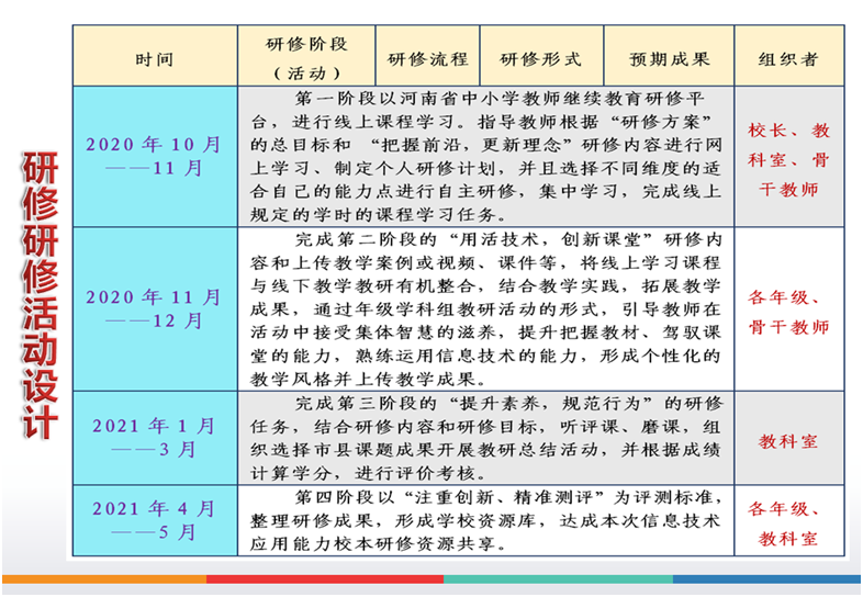10月份召开项目启动仪式和全校校本研修动员大会,解读学校信息化能力提升工程2.0校本研修实施方案及考核方案,划分研修小组,落实好学科组长与骨干教师、培训管理团队的对接,明确阶段工作任务。