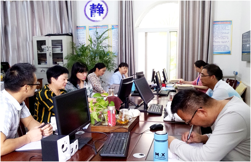 (潢川二中教师在电子备课室开展英语录播听评课教研活动)