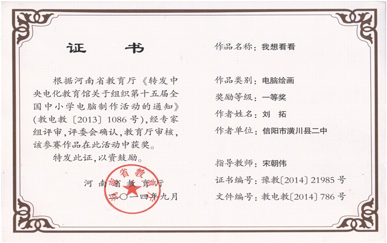 一份耕耘,一份收获。电脑制作活动的开展,提升了学生的综合素质,取得了丰硕的成果。2011年获得第十二届中小学生电脑制作活动最佳组织单位奖;2014年3月组织学生参加第十五届全国中小学生电脑制作活动,获得两个省一等奖,四个市一等奖;2015年第十六届活动该校有3人获市级一等奖,2人获市二等奖,3人获省级三等奖,潢川二中再次荣获最佳组织单位奖。