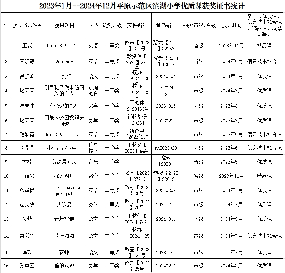 平原示范区滨湖小学优质课获奖证书统计