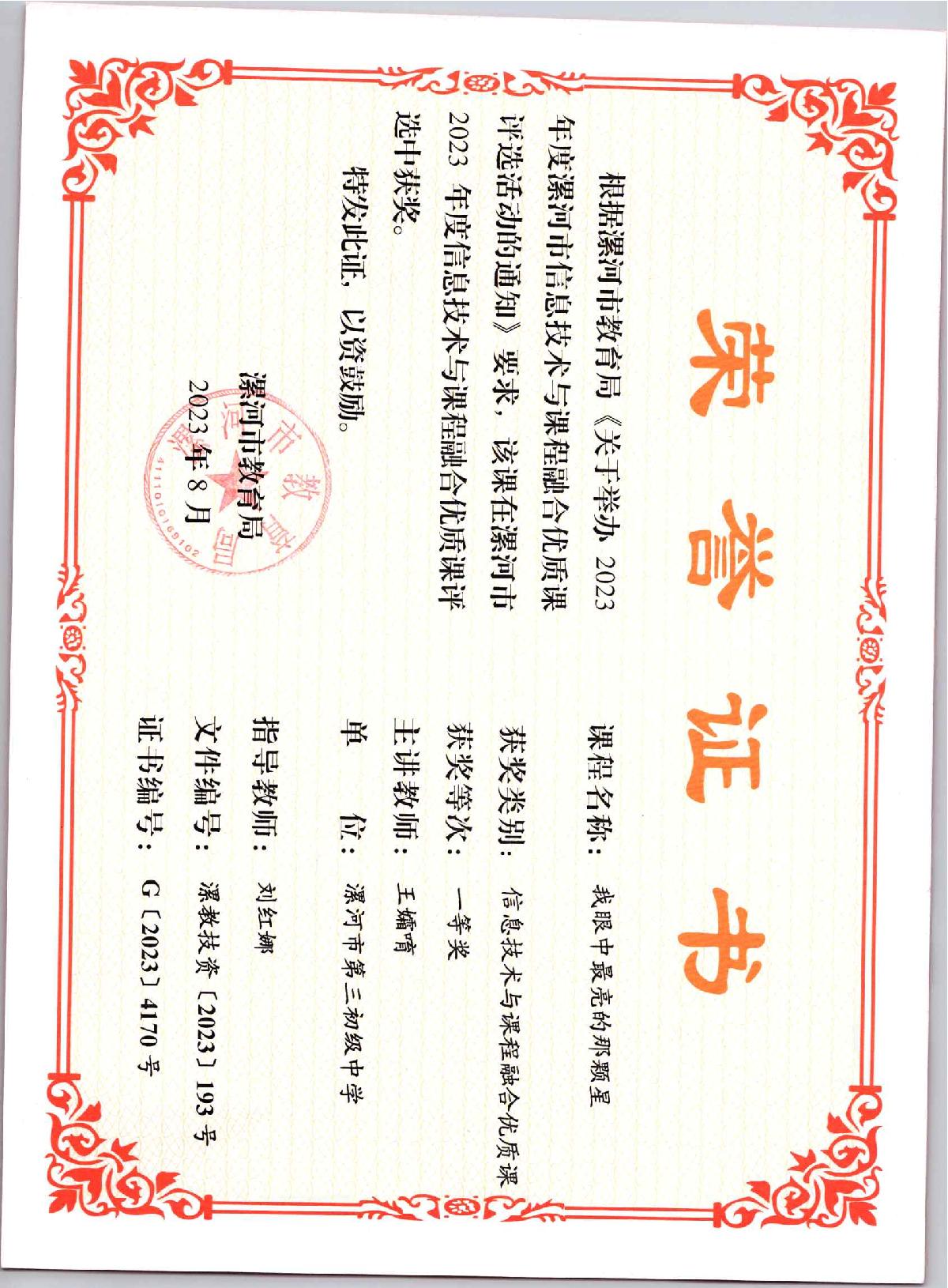 王孀唷老师奖证书