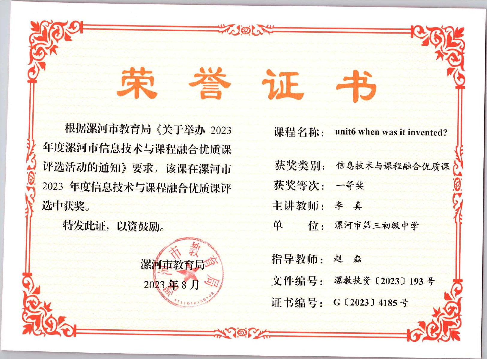 李真老师获奖证书