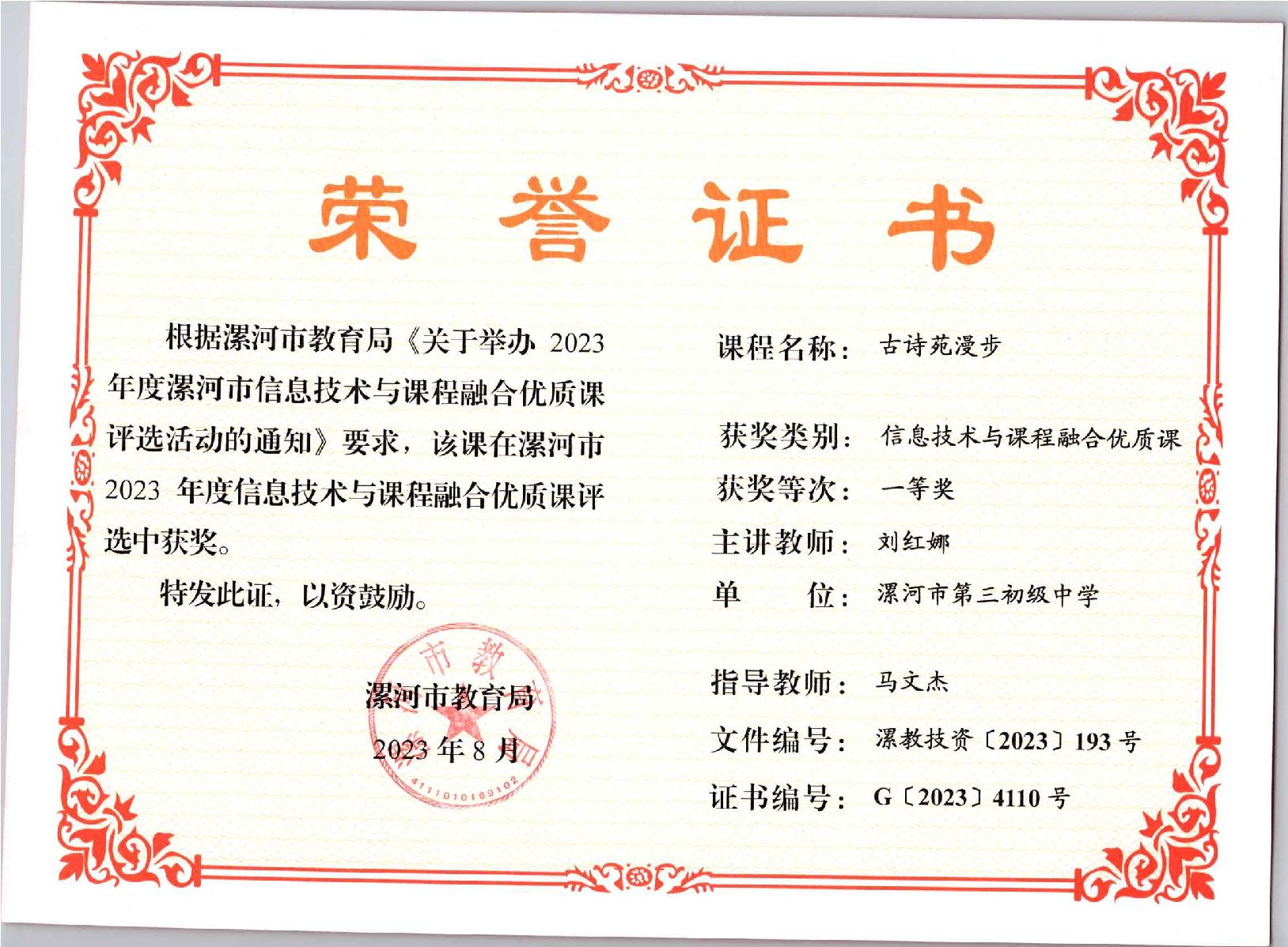 刘红娜老师获奖证书