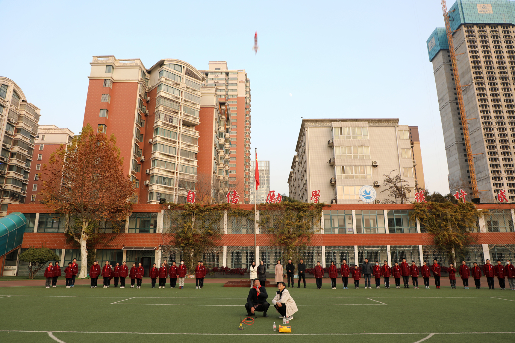 忻爷爷带着他自制的实验工具在操场中间为大家做“水火箭发射实验”