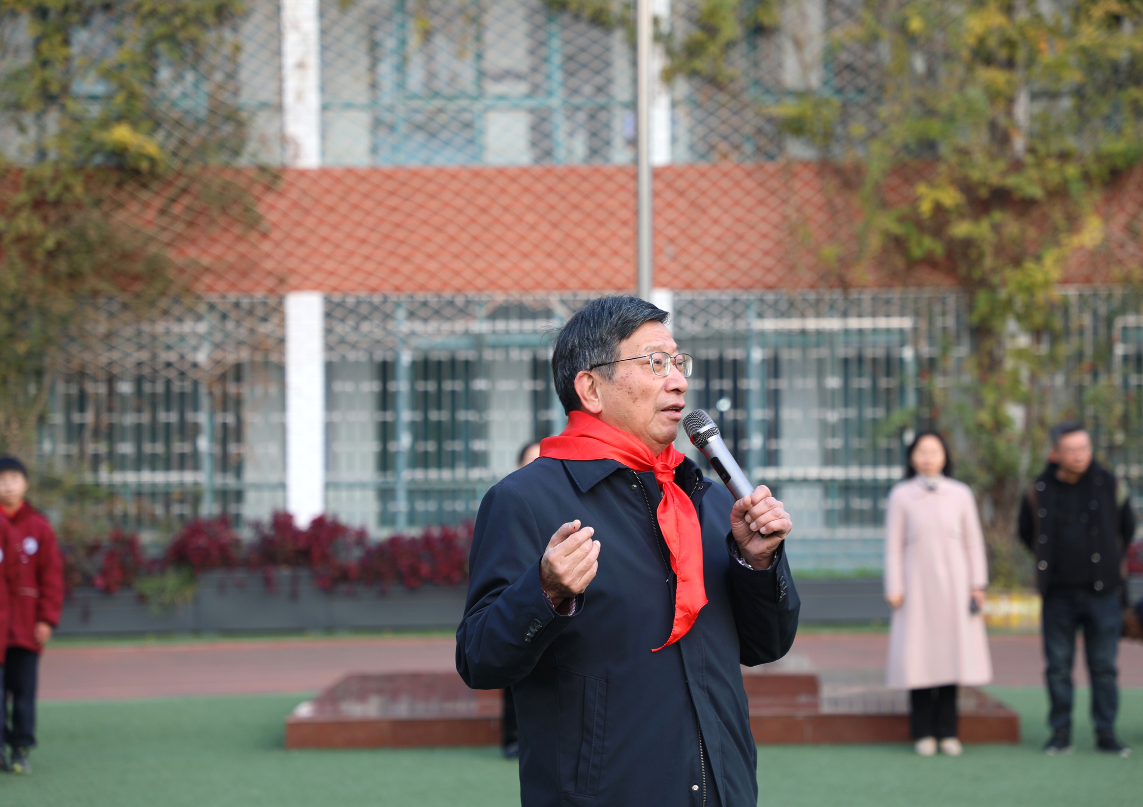 忻爷爷向大家讲解了水火箭的发射原理,随后进行了4次不同加压测试,同学们全神贯注地观看实验演示的差别,不时发出惊叹声,随着300多名师生的共同倒数,自制水火箭直冲云霄,欢呼声响彻整个校园。忻元华老师妙趣横生的科学实验课堂不仅为同学们带来了震撼体验,更重要的是激发了孩子们对科学的兴趣和好奇心,让同学们零距离体验了科学实验的“魔法魅力”。尤其是了解到忻爷爷已78岁高龄,在高校退休后继续从事中小学科普支教的这10年时间里,带着二十多套自制实验教具,跋山涉水走遍五省三十二所学校,被孩子们亲切地称为“魔法爷爷、科普爷爷”。他的事迹无不令全场的师生心生敬意,掌声经久不息。
