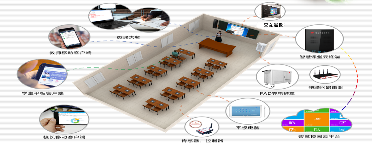 1.依托于信息化技术的智慧教室:我校所有教室均已配备智能交互黑板,同时数字化班教室配备有充电柜、物联网路由器、教室授课移动终端、蓝牙投影仪等。同时支持电子书包在课堂上的互动教学应用。