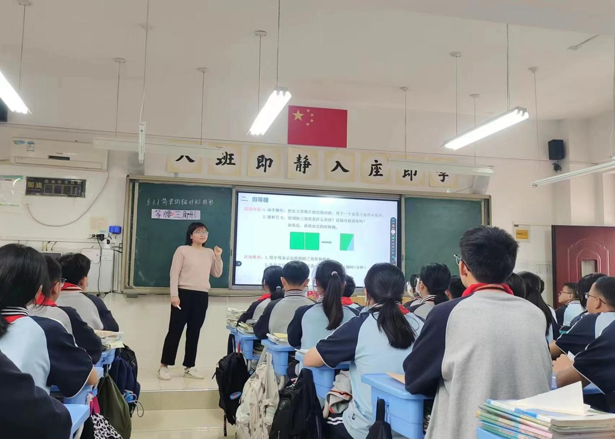 郭明颖老师这节课以猜谜语的方式引入课题。课程中郭老师注重通过学生自主探索的过程(让学生自己剪一个等腰三角形,通过动手折叠,发现其中的相等的角和相等的线段),以小组合作的方式来感受轴对称图形——等腰三角形的两条性质,充分发挥学生的主体作用,思路清晰,过程流畅。