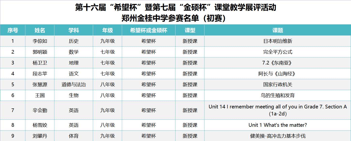 本次“双杯赛”活动,我校共有9位青年参赛教师,全部参加“希望杯”比赛,基本涵盖了所有学科。