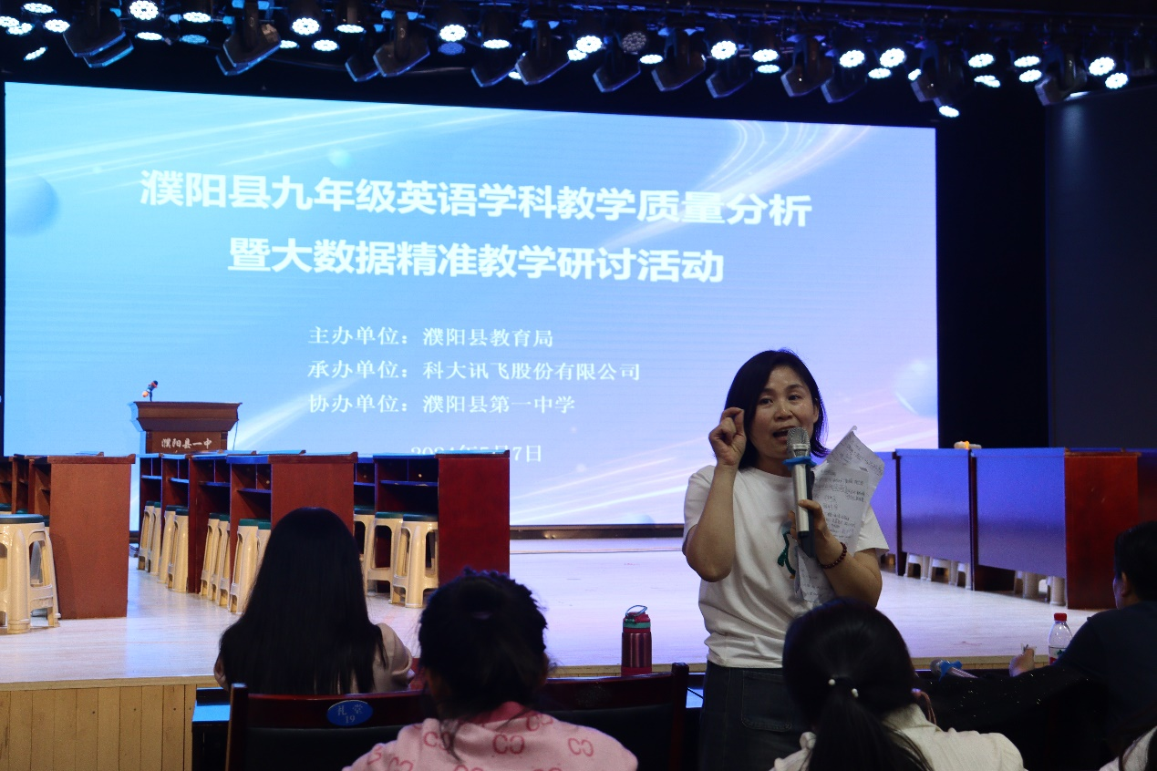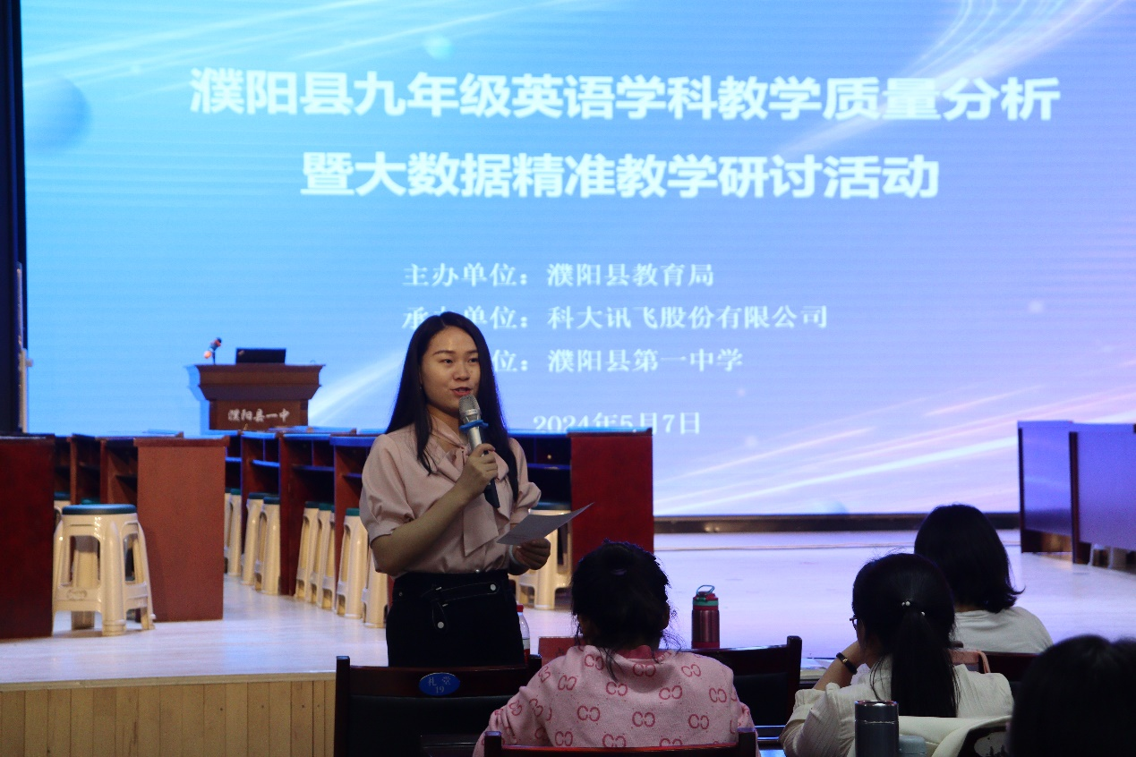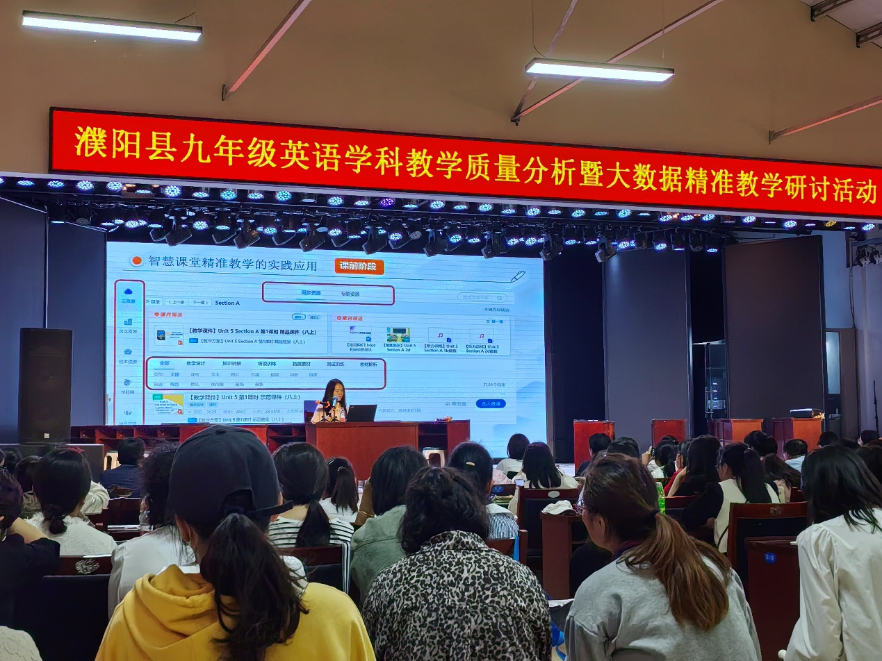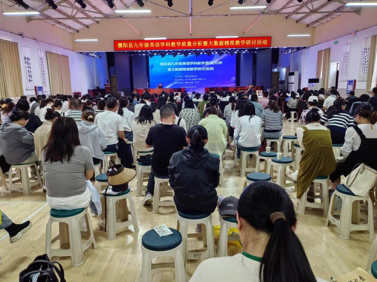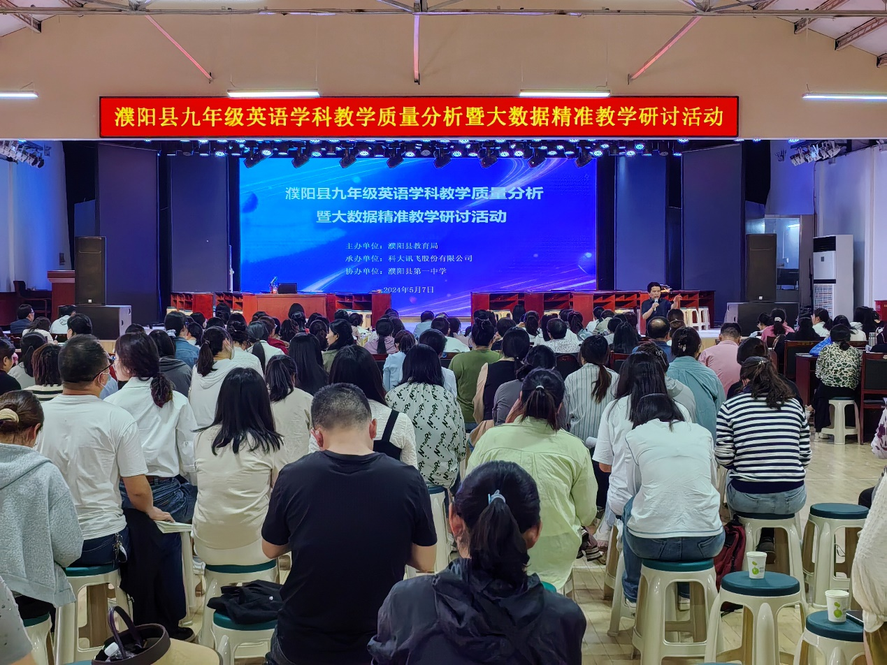 为深入分析濮阳县九年级英语学科教学质量,并探索大数据在精准教学中的实际应用,提升英语教学效果,5月7日下午,由濮阳县教育局主办、科大讯飞股份有限公司承办、濮阳县第一中学协办的濮阳县九年级英语学科教学质量分析暨大数据精准教学研讨活动成功举办。本次研讨活动旨在帮助全县教师应用大数据精准教学系统进行学业分析,共同探讨如何通过大数据分析提升教学效果,为学生们打造更加精准、高效的学习环境。濮阳县中小学教研室负责人孟亚、教研员王存国、教研员李劲松等出席会议,郑州市第七初级中学金桂校区英语教研组长卢婷作主题讲座,全县七八九年级英语学科教师300余人参加研讨活动。