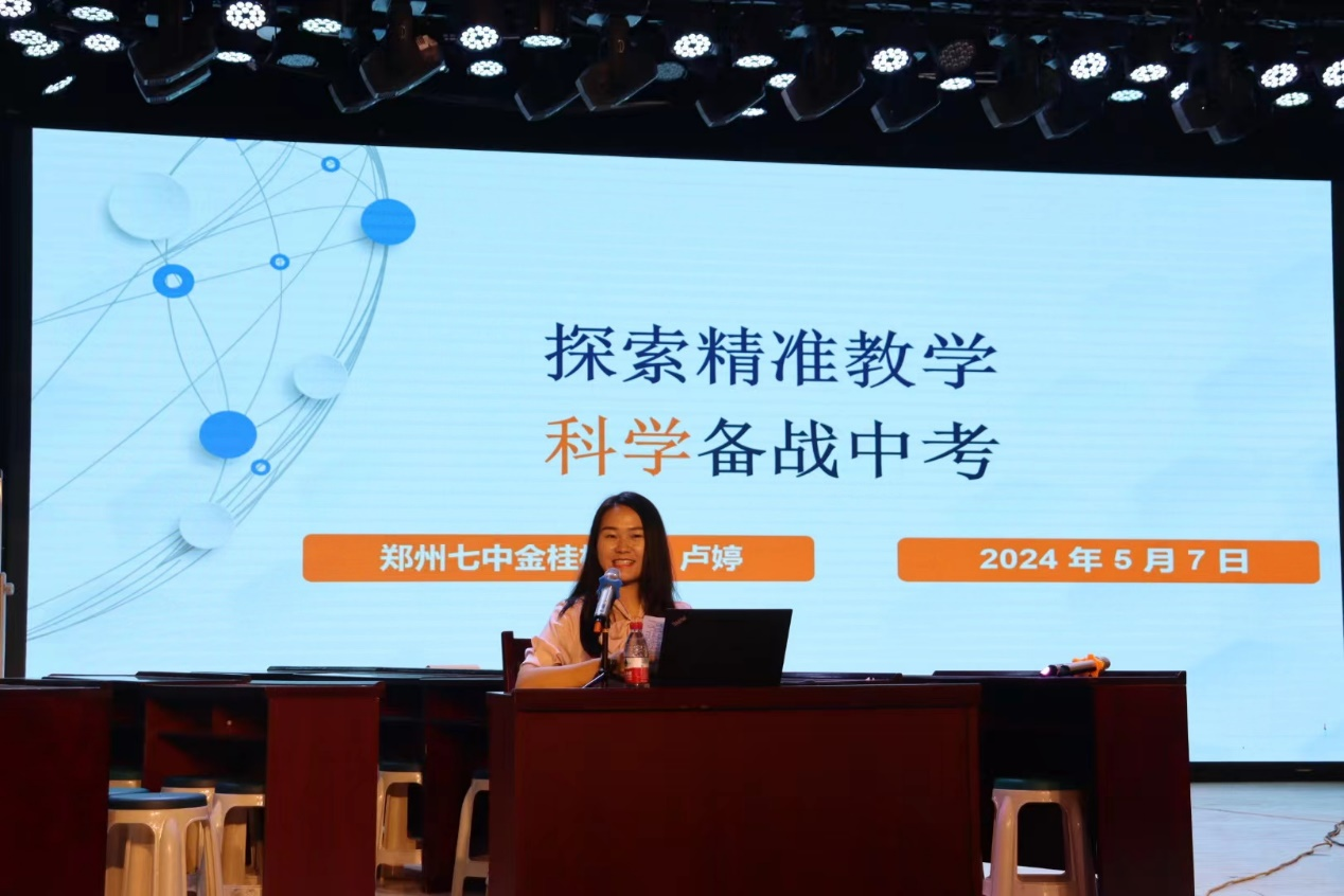 活动初始,郑州市金水区英语学科教研中心组成员、郑州市第七初级中学金桂校区英语教研组组长卢婷作精准教学及中考备考主题讲座。卢老师围绕“学生学情分析方法、智慧课堂精准教学应用实践、复习讲评课课例说课、中考备考指导建议”四个方面依次展开分享。她重点介绍了如何利用大数据精准教学系统和智慧课堂来辅助教学,包括怎样利用智能化教学工具开展精准学情分析、学生共性错题解决策略、小组合作互帮互助、高效精准讲评辅导,实现精准教学和因材施教。现场老师频频拍照并认真记录到笔记本上,提到智慧课堂和大数据分析功能的强大,并表示一定会好好学习理解,在教学中积极应用实践。