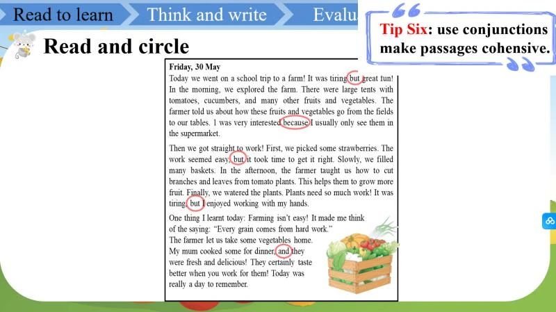 课堂上,老师巧妙利用学校公众号收稿通知创设真实情境,激发学生兴趣。以Sam的农场旅行日记为蓝本,通过“How did he feel about this trip?” “What did he do?” “What did he learn?”三个关键问题引导学生深入探究。学生们头脑风暴,丰富情感表达;绘制流程图,掌握过去时运用;挖掘文本内容,学会评价与收获的表达;寻找时间标志词,把握记叙顺序;学习运用定语从句和谚语总结,一步步攻克写作技巧。