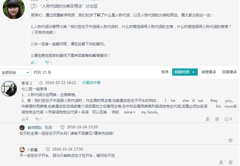 课题组还为学生提供了课内讨论区,打破时间、空间的限制,方便学生在自主学习中遇到困惑时,随时随地的进行学习交流与讨论。