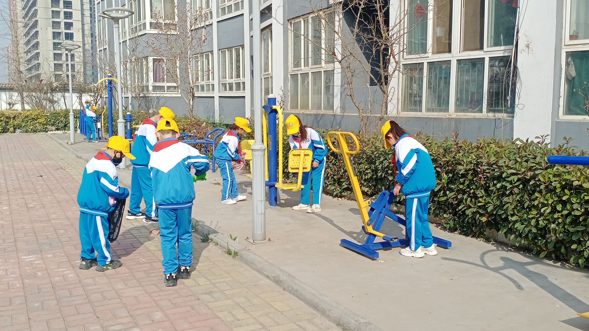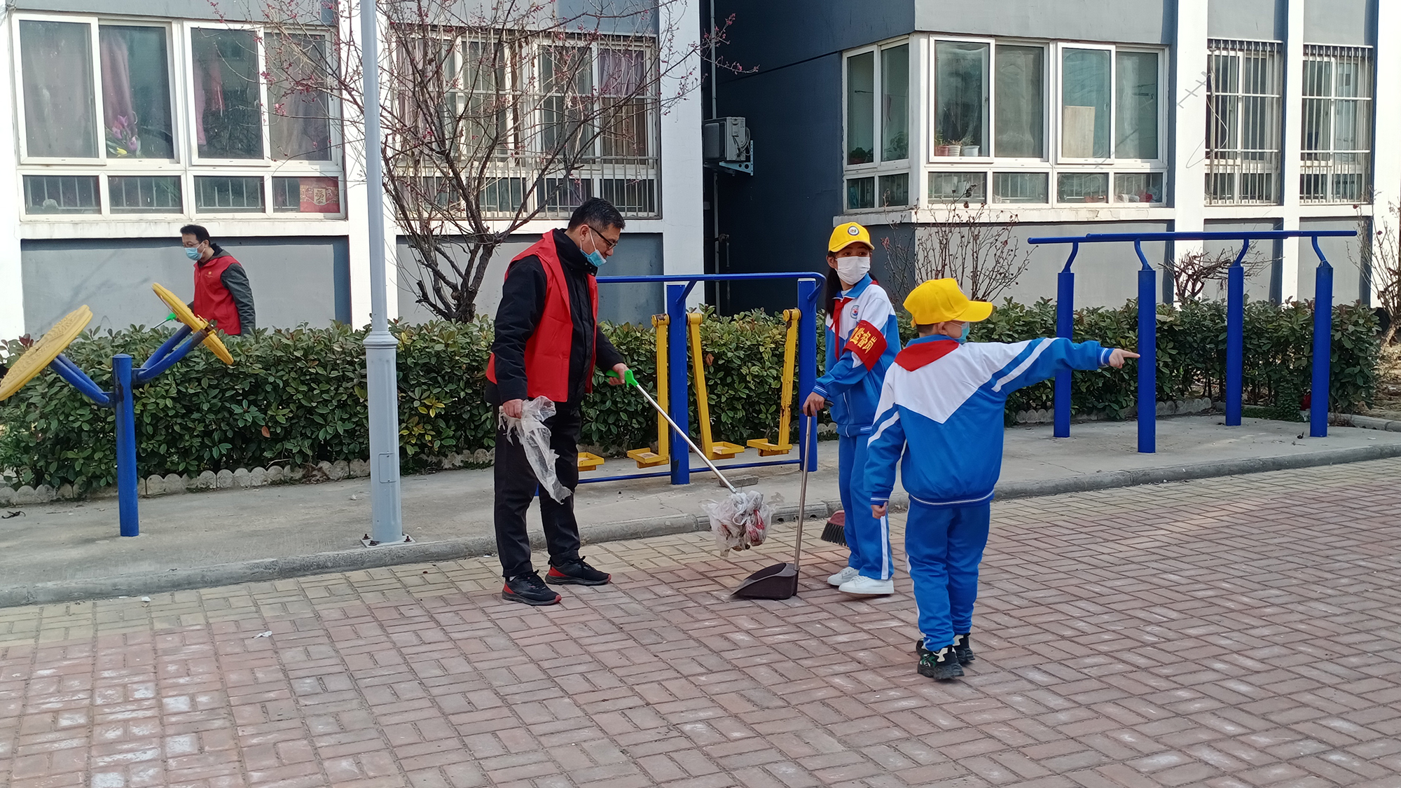 党员志愿者身先士卒,当表率,和少先队员们一起打扫地面的垃圾,用抹布擦拭健身器材,搬走绿化带里的建筑石块,追逐清理随风飞舞的废纸和包装袋,绝对不让它们“逃脱”。大家不怕苦不怕累,积极配合,团结一致,共同完成了卫生清洁。