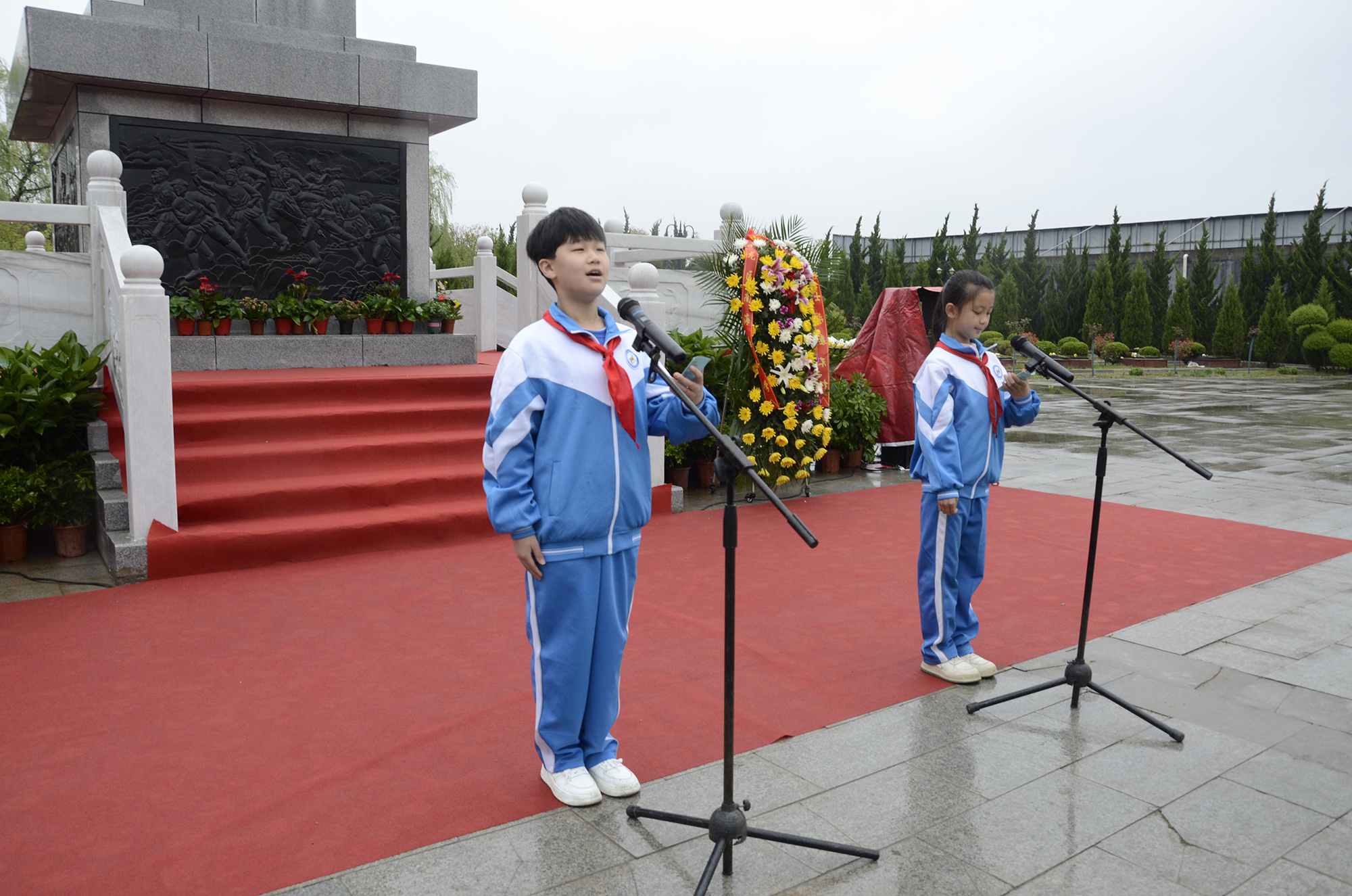少先队员代表向烈士献词:最深的悼念是铭记,最好的纪念是传承。英烈们是用生命守护我们的先辈亲人,我们是继承英烈精神的红色传人。从小学先锋,长大做先锋,请党放心,请先烈们放心。少年担当,强国有我!