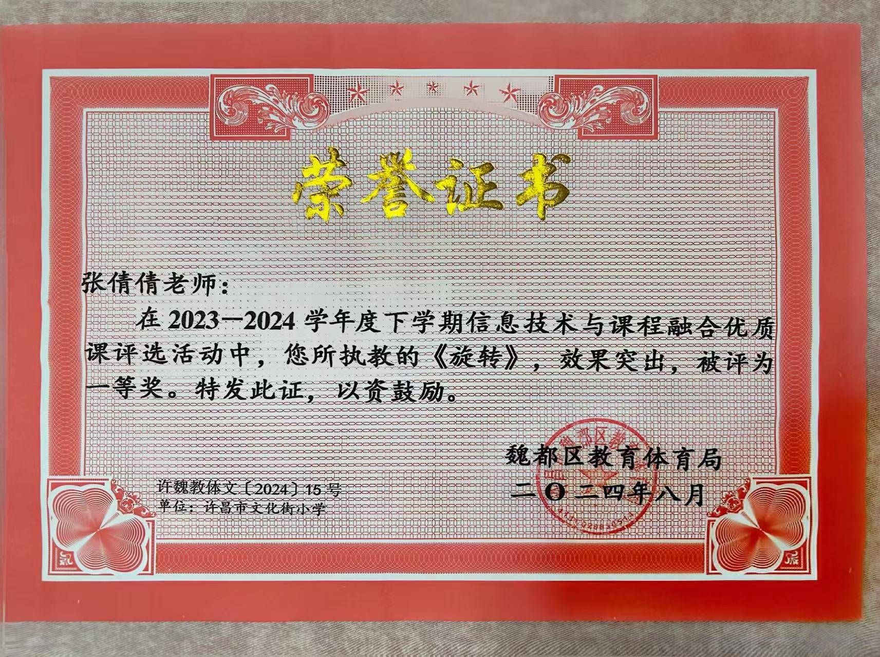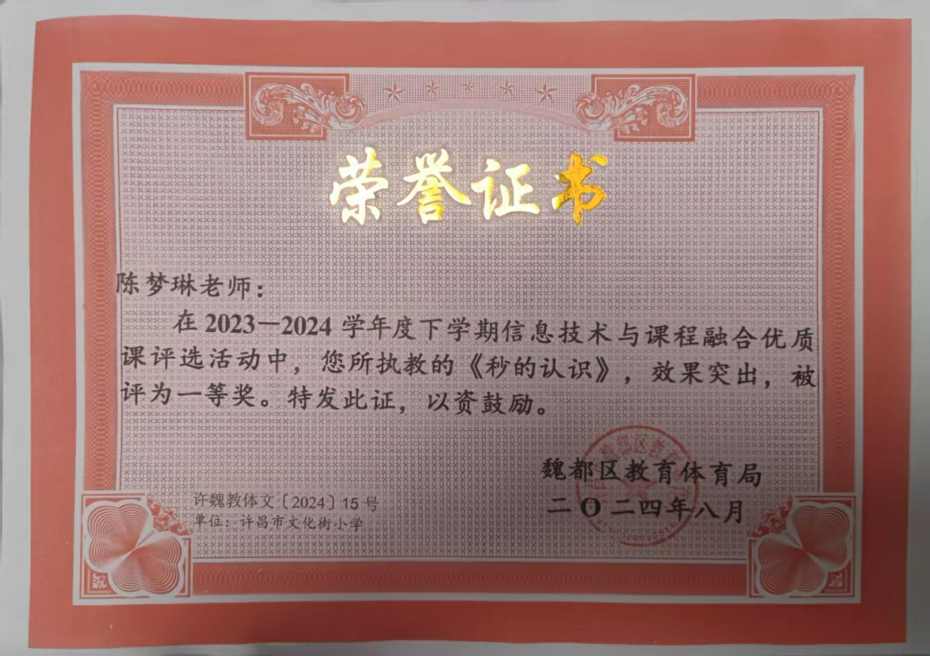 2024年许昌市文化街小学教师参加信息技术与学科融合课获奖证书