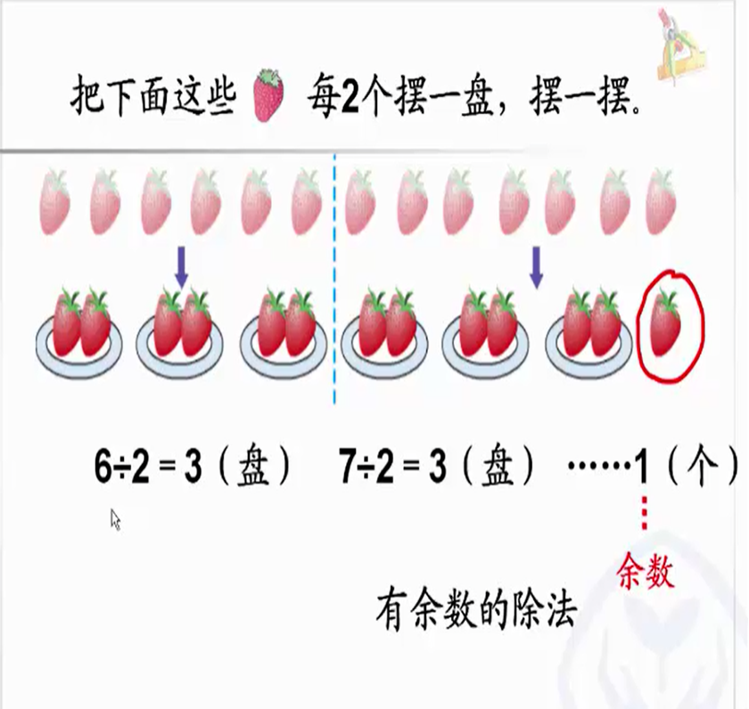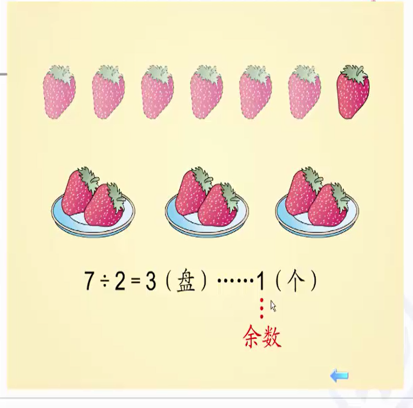 在《有余数的除法》这一课中,数学老师把信息技术手段融合在了数学课堂中,让学生生动形象地理解了“有余数的除法”这一概念。
