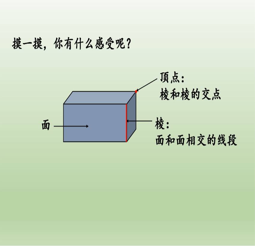 数学老师利用多媒体手段,将长方体的图片放在授课PPT中,并将面、顶点以及棱标注出来,借助图片以及动画能更加直观,并且将复杂的数学问题直观形象化,可以使枯燥的几何图形在计算机的演示下有声有色的动起来,大大增强了教学的直观性、趣味性。