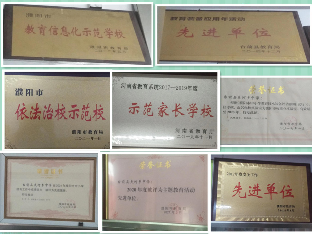 台前县夹河乡中学现有8个教学班,学生286名,专任教师35名。近年来,我校坚持立德树人根本任务,全面贯彻党的教育方针,在上级党委政府和教育部门的关心支持下,全体教职工勇于开拓、积极进取,办学效益和办学实力显著提升,学校先后被评为“市教育信息化示范学校”、“市标准化实验室”、“县教育装备先进单位”、“市安全工作先进单位”等荣誉称号。