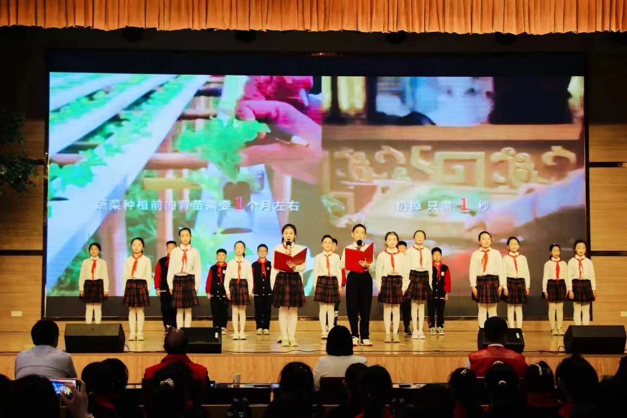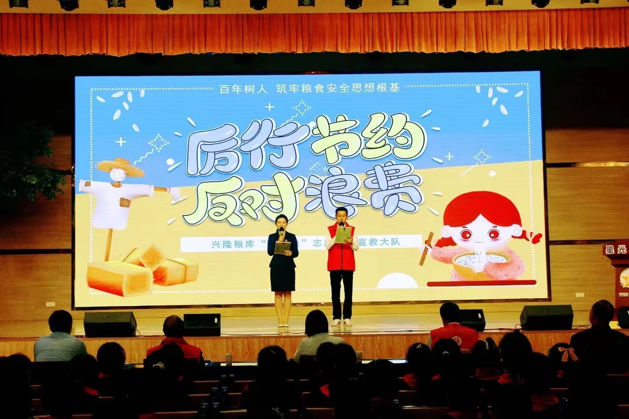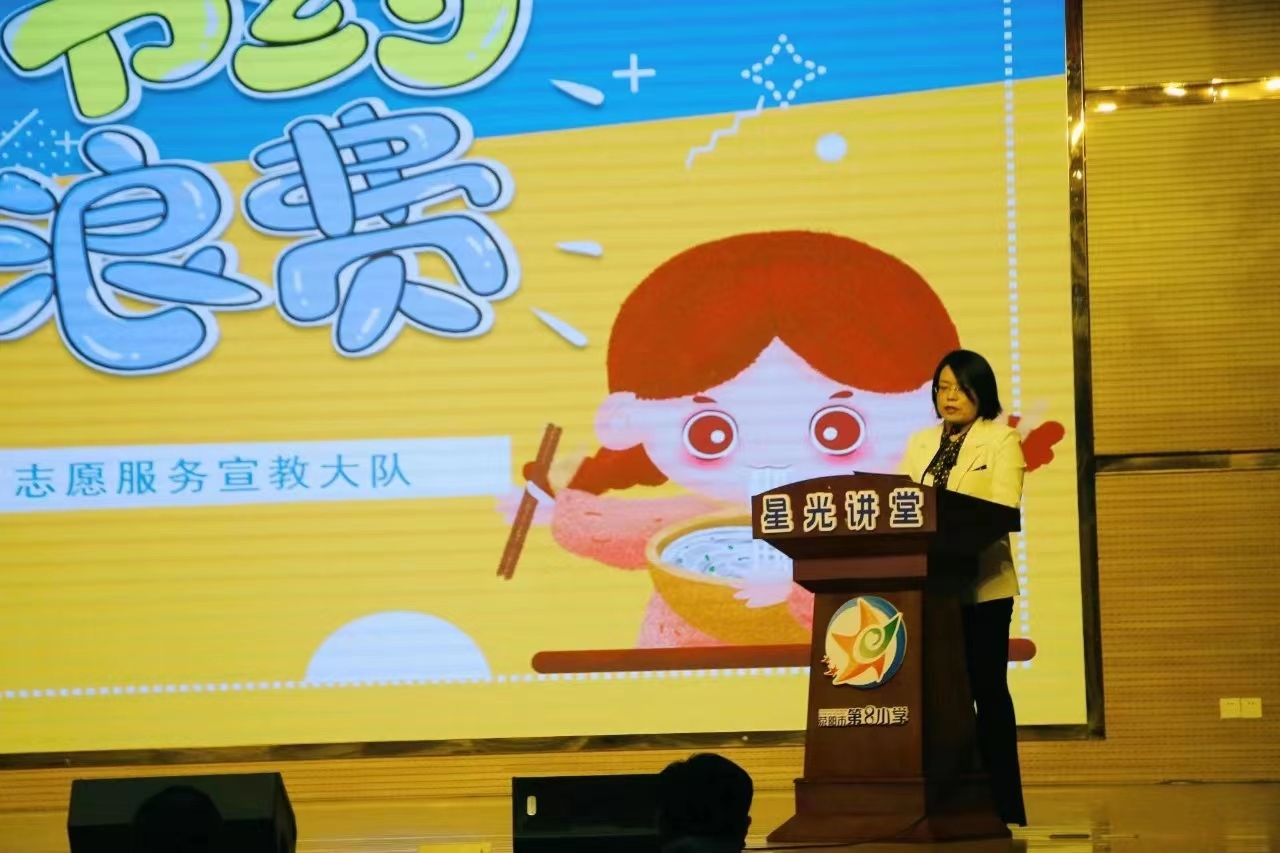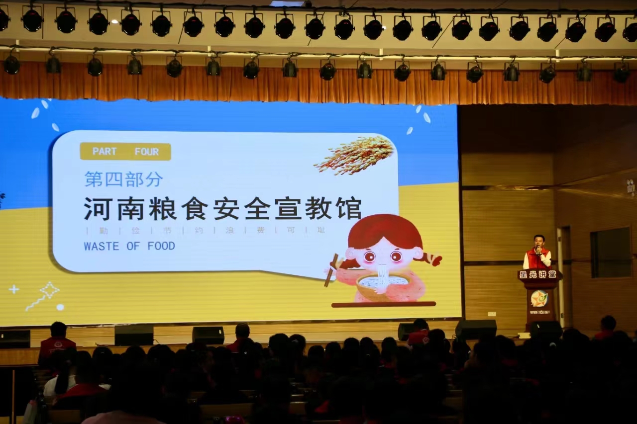 14 时,在学校大礼堂,荥阳市第八小学带来的诗朗诵《节约粮食,拒绝浪费》拉开了活动序幕。在观看了《仓廪实,天下安》粮食安全宣传教育片后,“壹粒粮”志愿者从粮食 安全、制止餐饮浪费到舌尖上的知识等方面用精彩的 ppt 和动画视频进行生动有趣的宣教,通过设置问题竞答和孩子们互动,为孩子们准备的小礼品增加孩子们的学习积极性,整场活动气氛活跃。听完宣教员的讲课之后,学生代表带领全场学生掷地有声地进行宣誓: “争做爱粮节粮小能手,爱惜粮食最重要。”在活动最后,郑州市粮食和物资储备局党组副书记魏来圈向荥阳市第八小学校长赠送了粮食安全宣教 书籍。