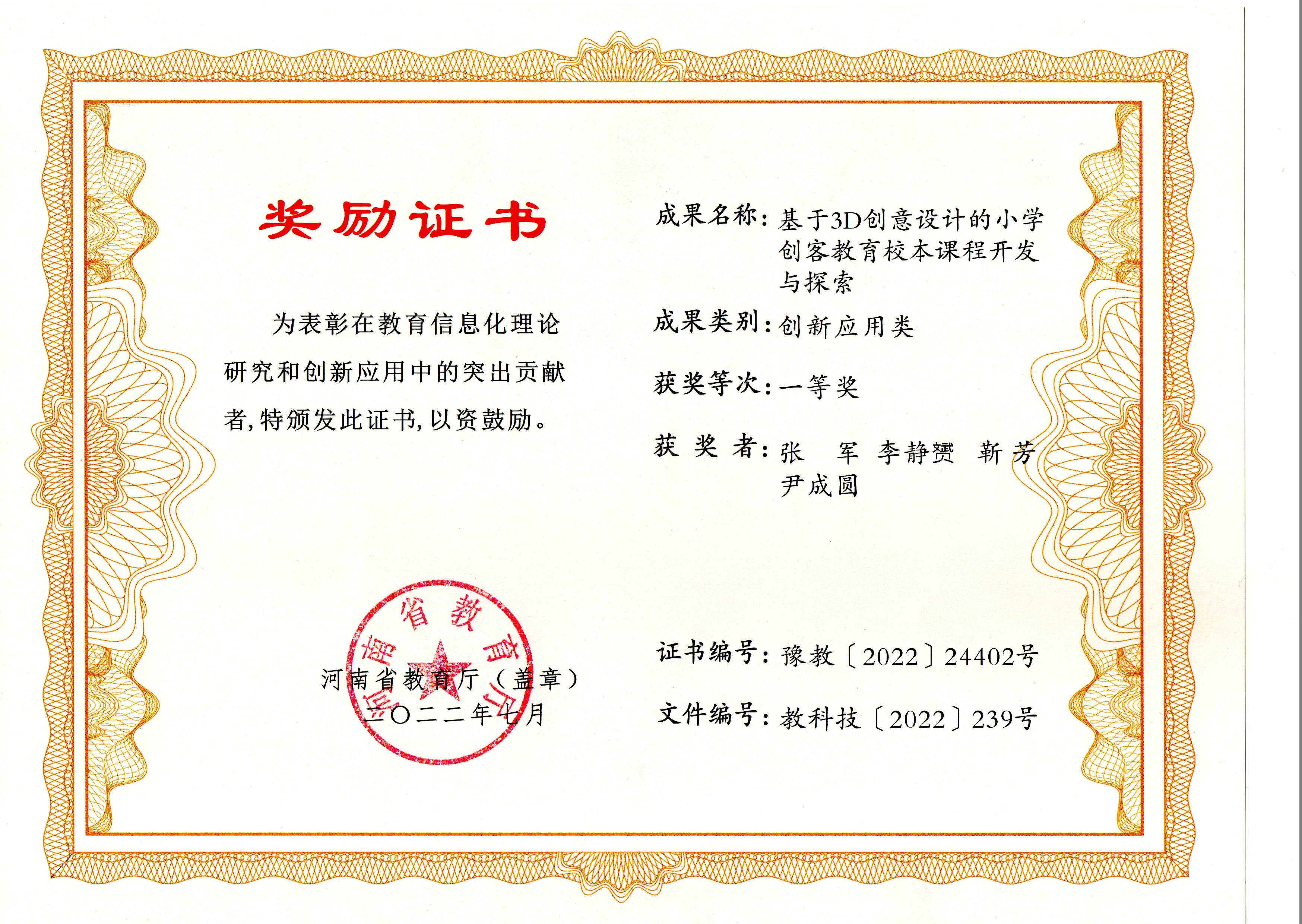 目前该课程已在解放东路第一小学的信息技术课程中开展,每个年级5课时,由学校的三位信息技术教师共同推广此校本课程,由易到难,前5课时为软件的基本操作,第6至10课时为制作单体作品,第11至15课时为制作由多个单体作品拼合的复杂作品,从第16课时开始为基于项目式的创新作品,每个项目3课时。目前已开展两个学年的校本课程教学,学生学习的兴趣非常高涨。在2020年第二十一届全国中小学生电脑制作活动中,学生的3D创意设计作品上交6件,3件获得河南省三等奖,3件获得焦作市一等奖。在2021年第二十二届全国学生信息素养提升实践活动中,学生的3D创意设计作品上交10件,3件获得河南省二等奖,7件获得焦作市一等奖。2022年第二十三届全国学生信息素养提升实践活动中,由于受到疫情的影响,学生的3D创意设计作品上交6件,目前已全部进入焦作市的比赛中,希望取得好的的成绩。