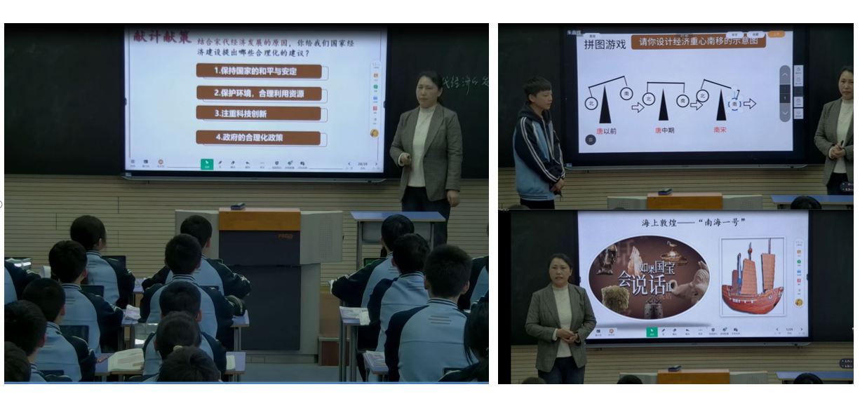 张芳芳老师执教的《宋代经济的发展》为大家展示了一节高效智能的智慧历史课堂。为了实现课堂的高效,课前张老师将导学案通过平板推送给学生。通过分析预习数据报告,有效把控,精准教学。课中,张老师充分利用智慧课堂插入视频、展示丰富多样的历史史料及课堂活动,增强教学的直观性、趣味性,提升课堂教学的互动性。为了突破经济重心南移这一难点。张老师设计了拼图游戏这个环节,学生在自己平板设计经济重心难移的示意图,并通过传屏功能将作品呈现在大屏上。学生在动手的乐趣中掌握了知识。