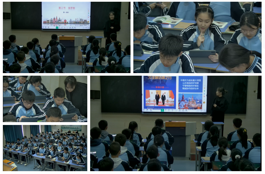 张姗姗老师执教的《俄罗斯》从最近的新闻时事热点“习主席访俄”为切入点,以游学为情景载体,设置四个学习任务“慧眼识图辩位置,察言观色识地形,析微察异知气候,按图索骥析气候”,以任务为驱动,以希沃智慧课堂为载体,引导学生运用地图等工具,完成空间位置辨识,地理现象观察和区域特征归纳,旨在引导学生学会自主学习,合作探究,同时将评价嵌入学生学习的全过程。基于希沃智慧课堂,本节课在四个学习任务中使用课件推送、学生互评、发表观点、课堂检测等多种课堂交互活动。