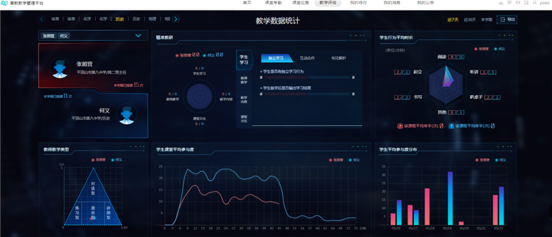 通过AI课堂系统与智慧班牌相结合管理,巡课督导制度更加高效地开展工作。分析系统不断扫描抓取课堂中师生行为数据,汇总展示3种教师行为和7种学生行为数据,这些数据能够反应课堂气氛、教学效果。通过将各个班级的数据整合在一起比较,可以看出各个班级之间的差异,表现在课堂气氛、违纪情况和师生互动等情况,这样的数据为巡课督导分析学情提供基本的数据依据,从而为班主任或者学校领导辅助决策提供依据,为校领导辅助决策提供依据。