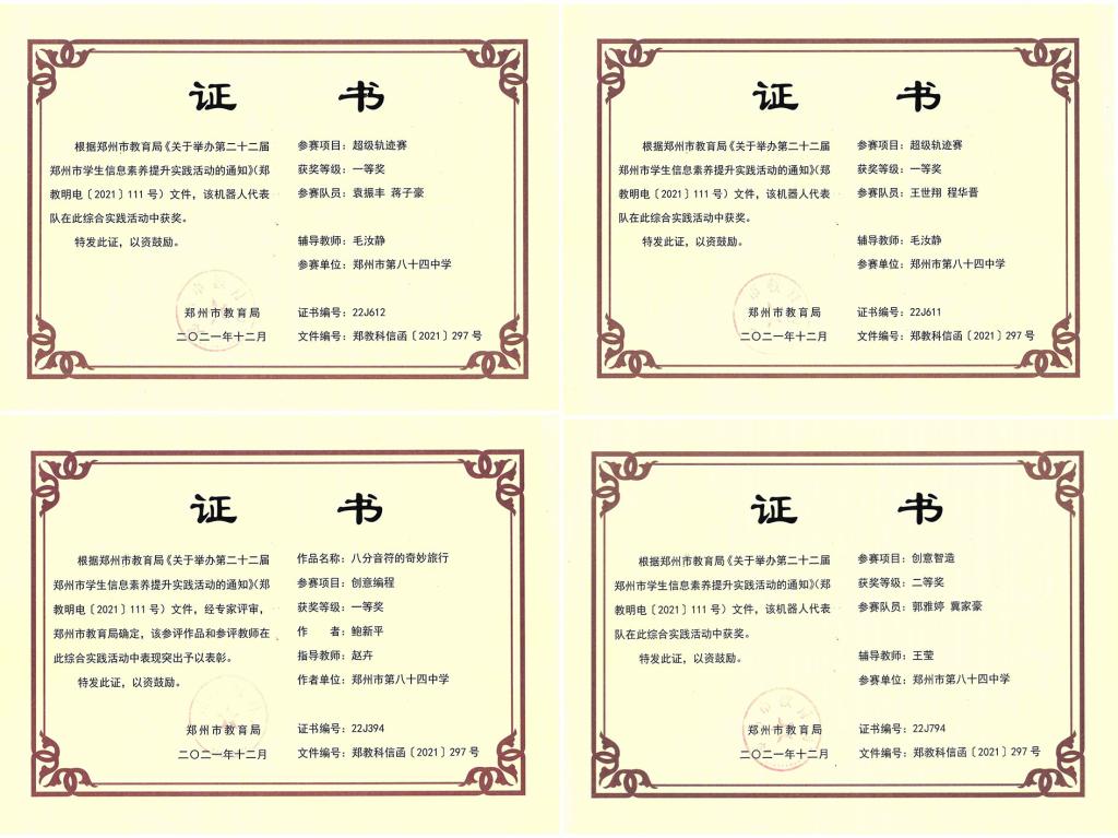 经过激烈的角逐,机器人项目获得郑州市信息素养大赛一等奖2个、二等奖3个,创客项目获得一等奖1个、二等奖2个。我校被评为第二十二届郑州市信息素养大赛优秀组织单位。其中机器人项目参赛队员王鑫庆、张玟凯、袁振丰、蒋子豪、王世翔、程华晋三组选手,以及创客项目参赛选手蒋帅斌、王鹏宇,在比赛中脱颖而出,以优异的成绩杀入河南省信息素养决赛,并在河南省信息素养大赛中获得超级轨迹赛项目二等奖、创客项目三等奖。