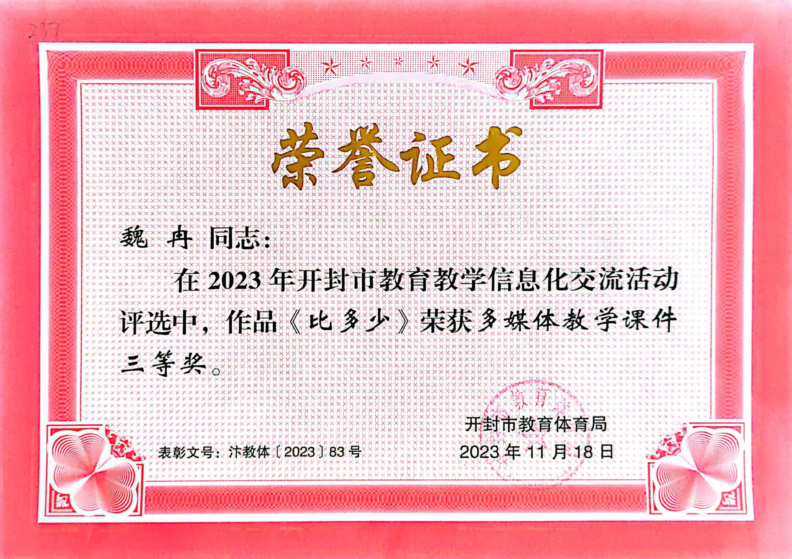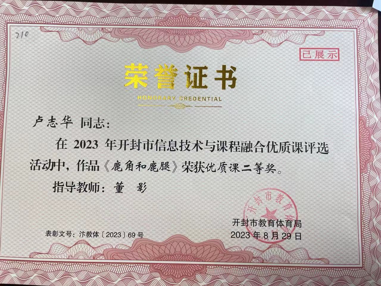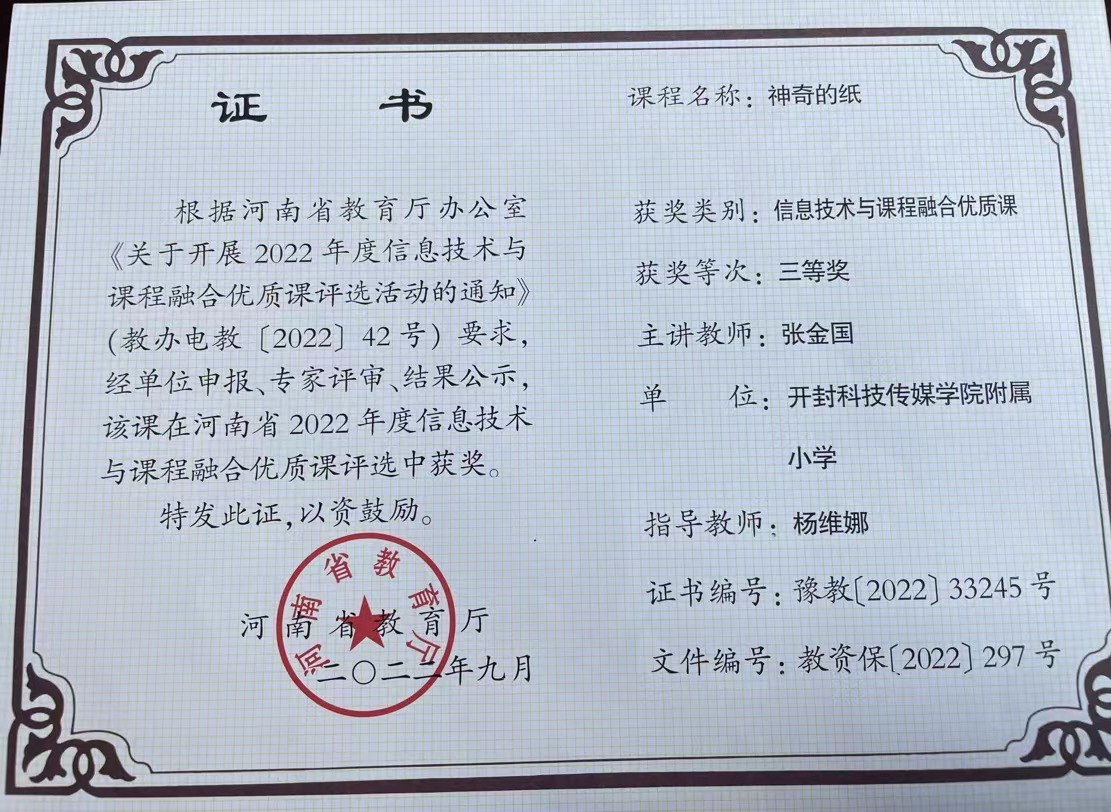 我校教师在信息技术教育中积极探索创新,并取得优异成绩。在2021年度我校被河南省教育厅评为“河南省中小学数字校园标杆校”;张金国同志在2022年度河南省信息技术与课程融合优质课《神奇的纸》评选中荣获三等奖、在开封市信息技术与课程融合优质课中荣获一等奖;卢志华同志在2023年开封市信息技术与课程融合优质课评选活动中,作品《鹿角和鹿腿》荣获二等奖;孔婷婷同志在2022年开封市信息技术与课程融合优质课《杨氏之子》评选中荣获二等奖;胡洁蒙同志在2022年开封市城乡一体化示范区信息技术与课程融合优质课《海底世界》评选中荣获二等奖;魏冉同志在2021年河南省基础教育精品课《比多少》荣获一等奖、在2023年开封市教育教学信息化交流活动评选中,作品《比多少》荣获多媒体教学课件三等奖;方澜同志在2023年开封市基础教育精品课《找规律》评选中荣获二等奖。