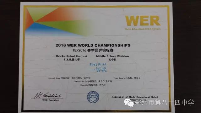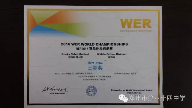 2016年11月19--20日,2016 WER世界锦标赛,在中国上海举办,来自30多个国家,5000多名选手同台竞技。河南郑州第八十四中学笃实创客此次出征2个小队,参加世界锦标赛我们任重道远。