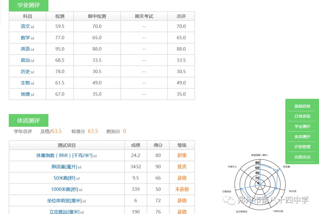您还可以在成长档案中查看孩子的学业成绩、体质健康数据,进行有针对性的练习。