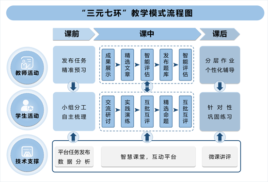 以学校AI智慧课堂环境为依托,“三元七环”初中语文记叙文教学模式首先在教学理念上作出突破,以学生为主体,教师为主导。“合作、主动、创新”是贯穿学生核心素养发展的三大元素,以智慧课堂为平台,根据课前、课中、课后三环节开展七项教学活动。既加强了教师引导的力度、深度与精准度,也调动了学生最广泛的积极性与主动性,更在智慧技术的支撑下大大提高了教学效率。