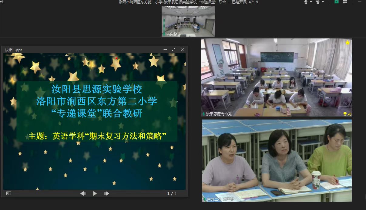 2022年6月15日下午,洛阳市东方第二小学和汝阳县思源实验学校通过“专递课堂”远程实时互动的形式,两校英语学科教师围绕 “期末复习的方法与策略”进行了一场别开生面的教研活动。