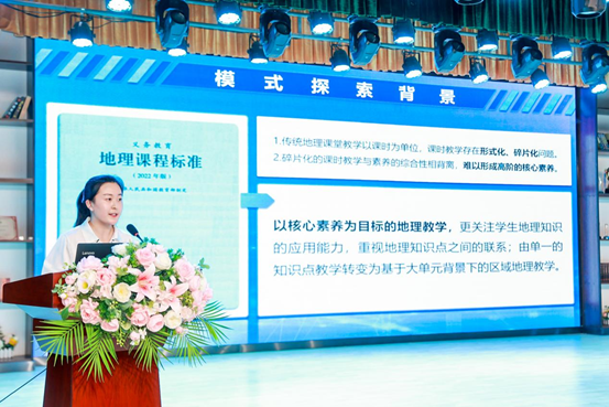 除此之外,地理学科李楠老师分享了主题为《基于大单元教学下的 “五步三维” 区域地理教学模式实践探索》的应用经验,以课例分析+模式分享的形式从模式探索背景、模式内容简介、模式实践案例等方面展示了地理学科在信息技术作用下的课堂改变。地理学科依托智慧课堂技术,改变传统教学方式,融合信息化教学手段,寻求区域地理教学的有效模式、致力于减轻学生负担、切实提高地理课堂效率。此次汇报受到了大东考察团教师的一致好评。