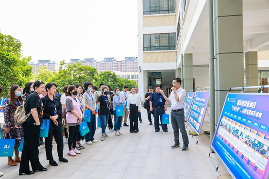 考察团入校后,信息中心吴帅主任从学校基本介绍、信息化建设概况、学校管理机制、师生应用成果等方面介绍了学校的“教、学、研、管”信息化教育全景。学校全力构建以“智冠管理提效率、智冠课堂促融合、智冠赋能助提升、智冠教研共成长、智冠学习树新风”为一体的“五维一核心”的智冠教育新体系。从学校建设的顶层设计到应用层面的成果沉淀,引起了大东区考察团的强烈兴趣。