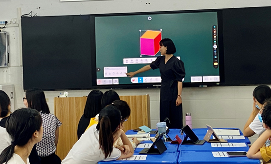 为了使老师们更加了解智慧课堂的功能特性,明晰信息技术应用下的新型授课模式,李楠楠老师不仅对智慧课堂的产品进行了全面演示,还结合课例为老师们重点演示了学科工具。结合《黄河颂》展示了语文划词搜索,实时链接到互联网资源,打破了课堂的空间界限,让学生在语文课堂的收获不只局限于课本知识,而在寓教于乐中拓展了眼界。结合《生活中的立体图形》演示了数学学科工具立体几何的灵活运用,让枯燥的数学概念在智慧课堂先进的AI技术和丰富的学科工具下变得生动有趣,创新的数学课堂大大提升了师生间的互动性。