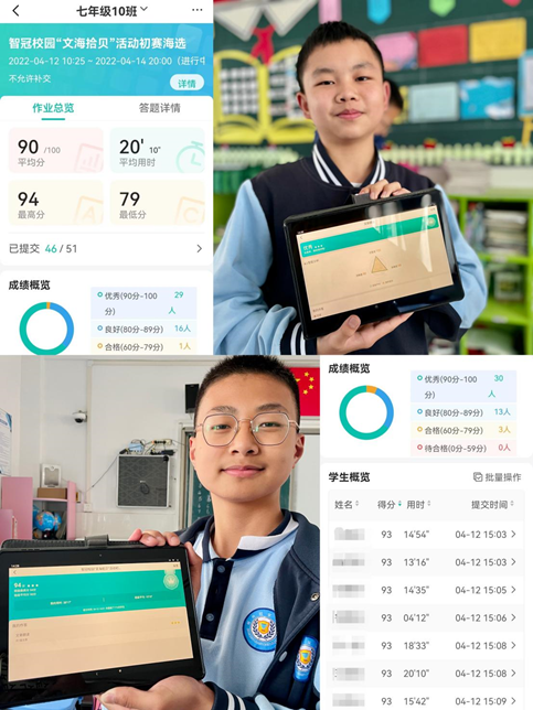本次大赛共分为三轮,初赛海选、复赛入围和决赛比拼。初赛海选阶段,评审团通过平板为七年级620名学生设置了科技感十足的朗读情境,吸引每位同学都参与到本次比赛中来。经过科大讯飞智能AI评测技术,结合语文学科评审团打分的评选方式,选拔出120位同学参加复赛。