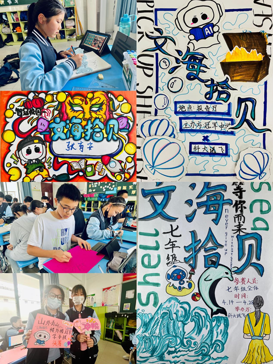 除此之外,参赛选手们还有最强大的后援力量,在准备阶段,七年级的孩子们就为参赛选手设计了专属的参赛海报、应援手牌等,在决赛现场为自己喜爱的选手加油鼓劲,同时在复赛中表现优异的选手和所有的参赛选手共同为大家带来精彩合颂朗读《盛世中华》,不仅让参赛的孩子们得到锻炼,其他学生也在不同领域展现了自己的才华,在大赛中成长。
