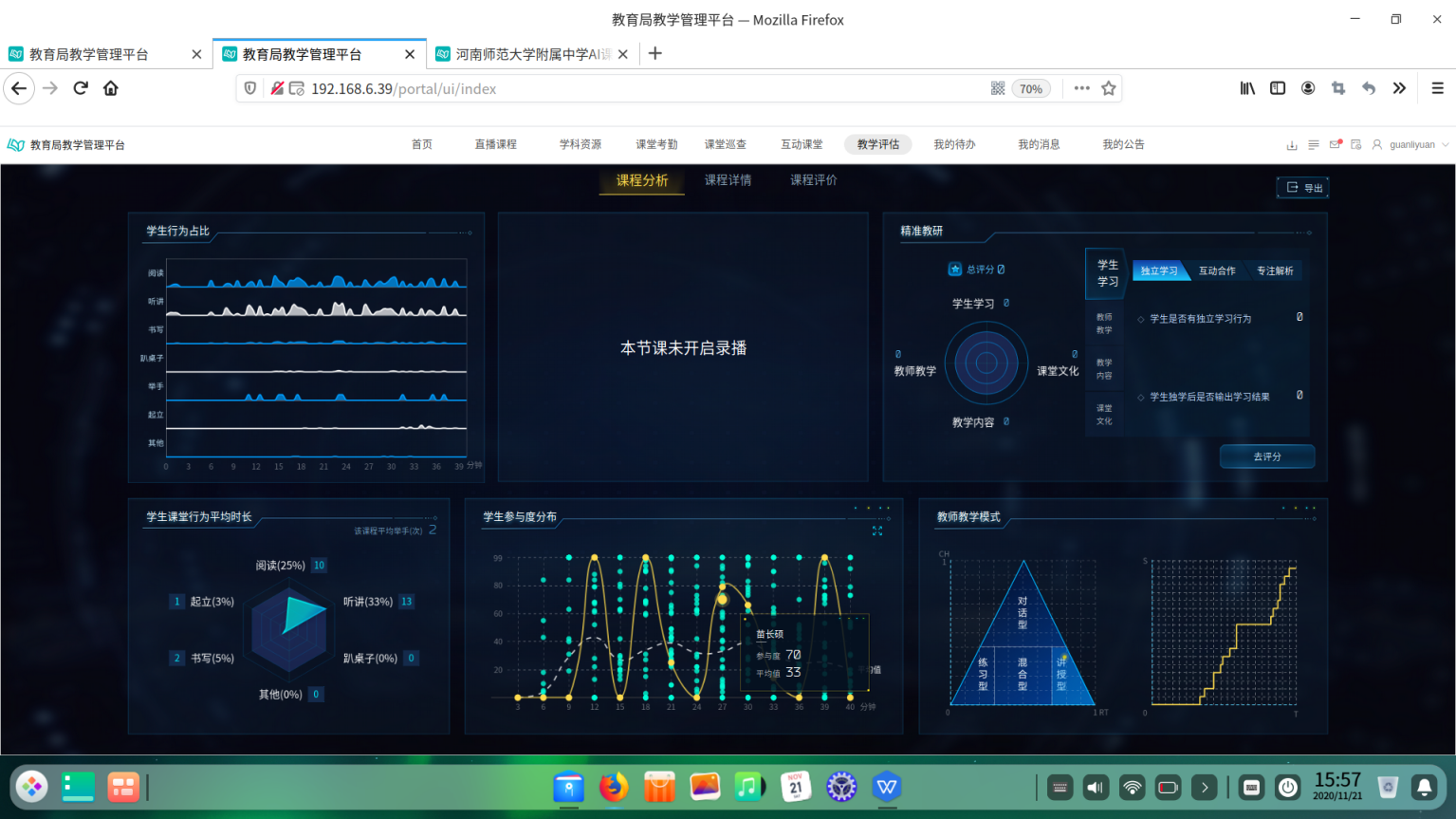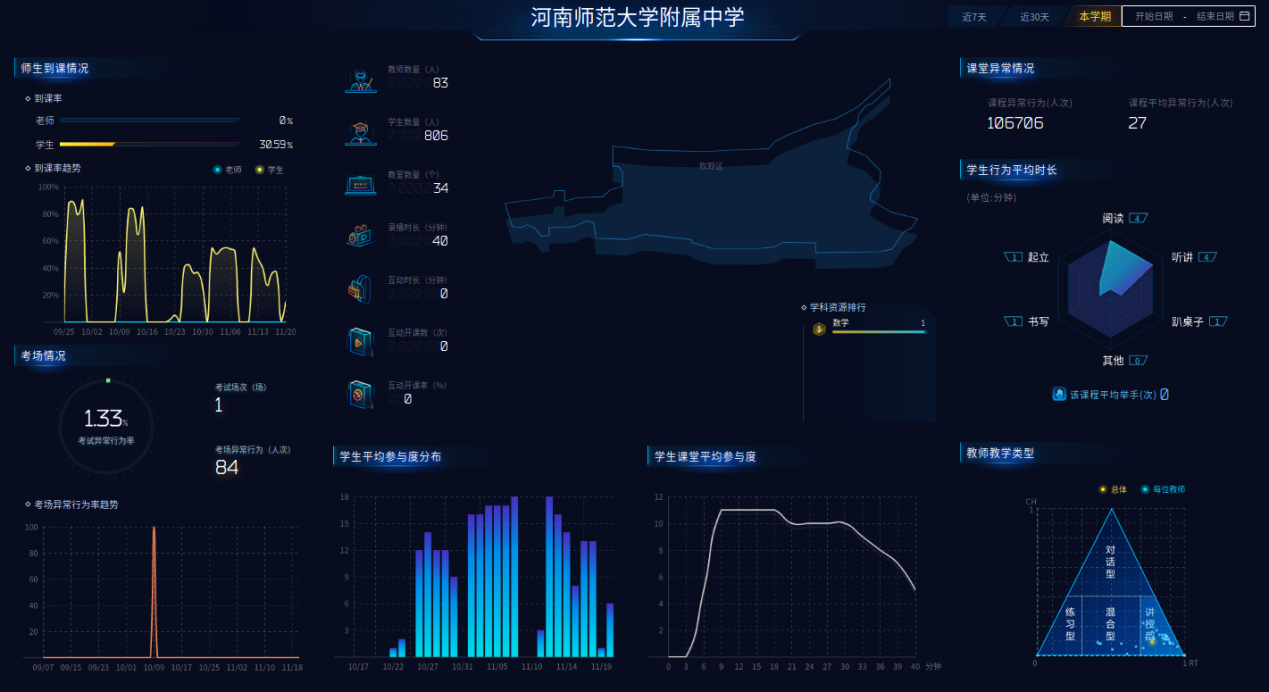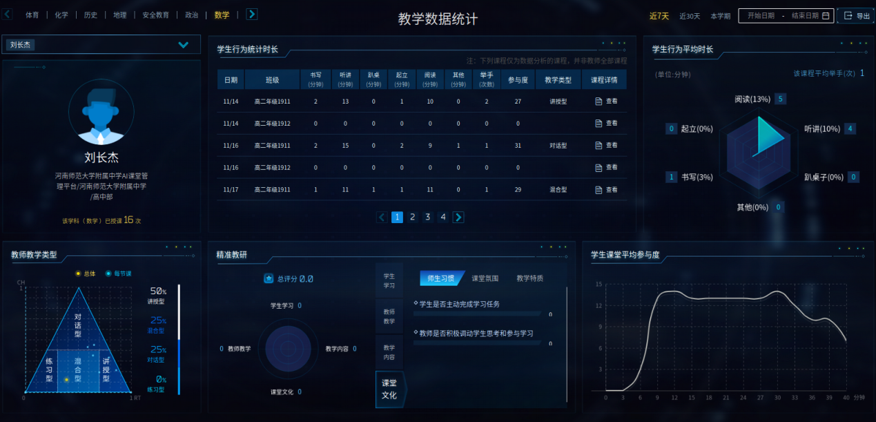并通过教学数据统计,可以对教师教学质量的精准评价及问题诊断。可以对每一位教师的每一节课,乃至每一节课堂中的学生进行多维数据的画像。