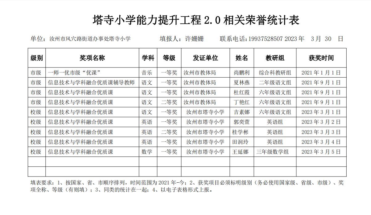 塔寺小学能力提升工程 2.0 相关荣誉统计表