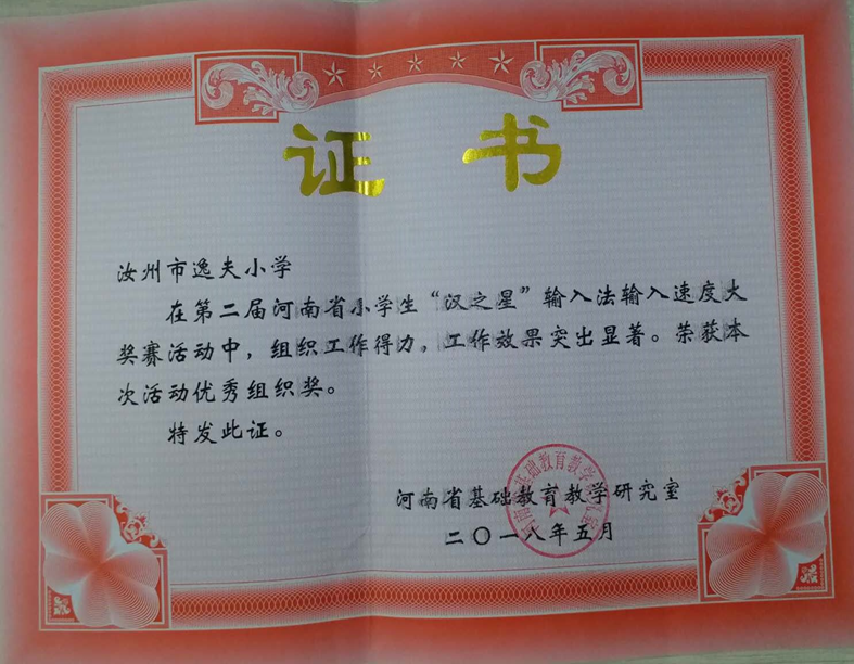 河南省小学生“汉之星”输入法输入速度大赛在三门峡举行,课题组老师接到通知后,认真筹备,积极组织。在课题组成员认真辅导下,我校五名参赛学生在比赛中以出色的表现和扎实的功底,取得了优异的成绩。我校的李阔同学在大奖赛中,以优异的成绩荣获小学低年级组三等奖。李宣乐、任美妍、肖轩辕、李卓轩等同学也以出色的表现分别荣获小学低年级组优秀奖,课题组赵冰莹、郭淑芳、王浩侠、张亚鹏也评为优秀辅导教师。同时,我校在这次大奖赛活动,以得力的工作组织和显著的工作效果,得到河南省基础教育教学研究室的肯定,荣获优秀组织奖。