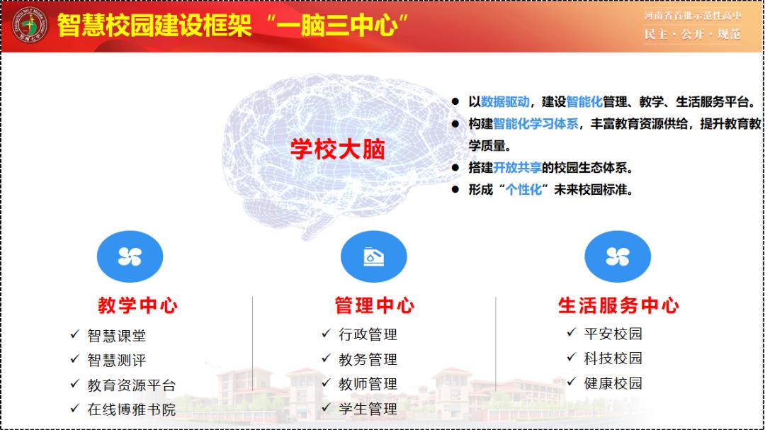 8月16日,学校参加“中小学信息化教学改革”实验校申报汇报会。学校的智慧课堂、学校大脑、智慧校园建设情况在一众学校信息化建设中脱颖而出。“一脑三中心”的架构也囊括了师生的教学、管理和生活服务的方方面面。