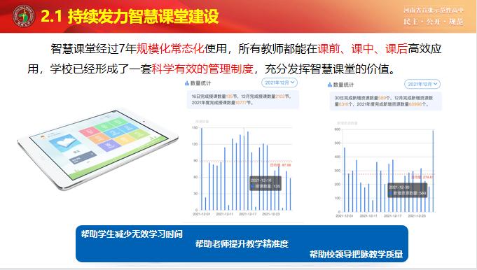 新学期也是落实“三新”的开始,新学期学校升级Ai课堂,打造高效互动课堂。2016年全面引入智慧课堂,经过7年常态化应用,学校已经探索出一套科学有效的管理、使用模式,授课教师都能高效灵活使用,已经建设50万优质教学资源,智慧课堂每年授课2万余节,结合网络阅卷并打造个性化学习手册,帮助学生减少无效学习时间,大幅提升学习效率,探索出的“教、学、评一体化模型”,被评为2021年度全国信息技术与教育教学深度融合示范案例。