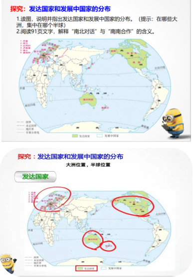 在授课环节中针对于完成目标2设计探究说明并指出发达国家和发展中国家的分布。采用学生讲功能,学生可以拿着自己的智慧机边讲边操作,尤其是地理更注重的圈画指出。
