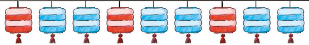 灯笼的排列规律是:以红灯笼蓝灯笼蓝灯笼为一组重复排列。后面继续摆呢?(课件展示)对,一直是红灯笼蓝灯笼蓝灯笼。(课件展示)